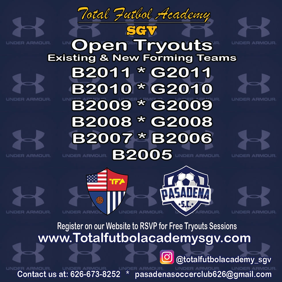 Open Tryouts - 2019TFA-SGVDec 22, 20181 min readWe will be hosting Open Tryouts for Players Born 2011 thru 2005. TFA-SGV is a Soccer club that serves the Greater Pasadena Area and all of theSan Gabriel Valley Region. Please fill out Tryouts Forms to receive information about time and location. Click link for tryouts form.